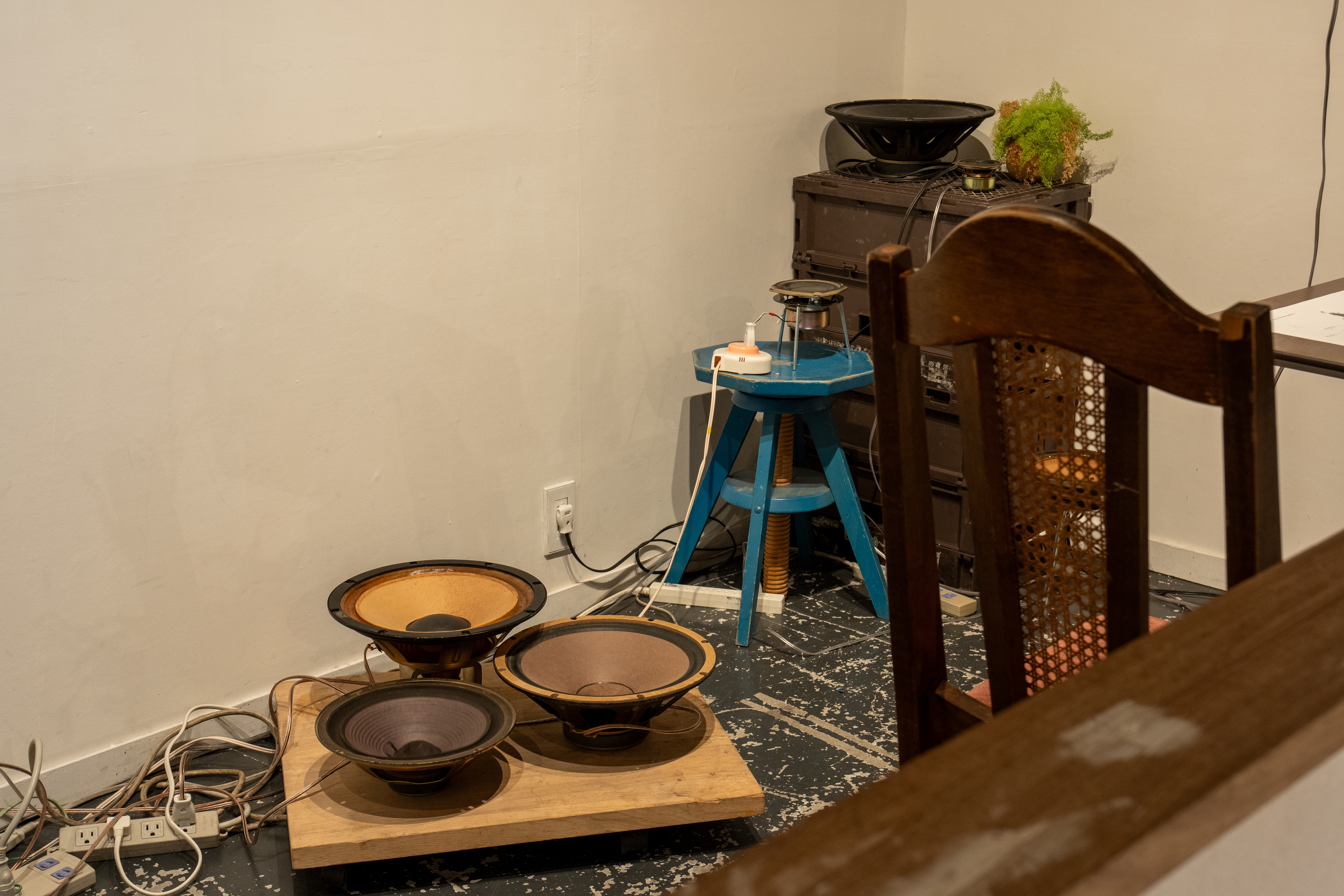 展示空間には、スピーカーと複数の装置、それらを接続する配線が設置される。空間に点在するスピーカーは低い唸りのような音を絶えず発している。そのうちいくつかのスピーカーには物体が載せられ、振動に合わせてカラカラと音を立てる。各スピーカーには、2つのトランス(電磁誘導によって交流電圧を変換する装置)によって降圧された電気が送られ、その電力が電磁誘導によって膜の振動へと変換される。接続された電圧計やアナログ式オシロスコープは、その電気の揺らぎを視覚化する。商用電源AC100Vを音として鳴らすための装置を通じて、私たちの日常に背景に流れ続けている通奏低音としてのインフラをあらためて前景化させる試みである。