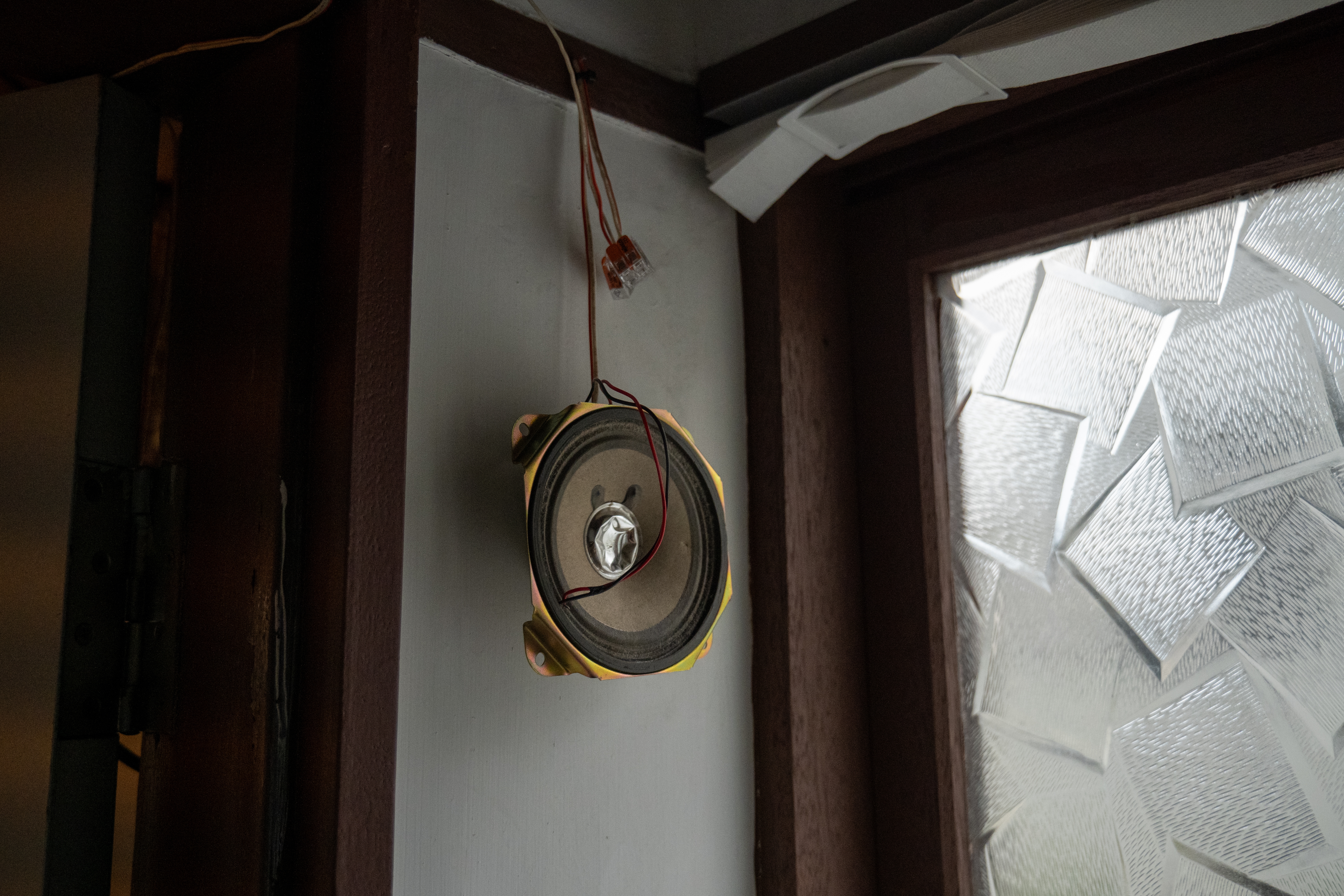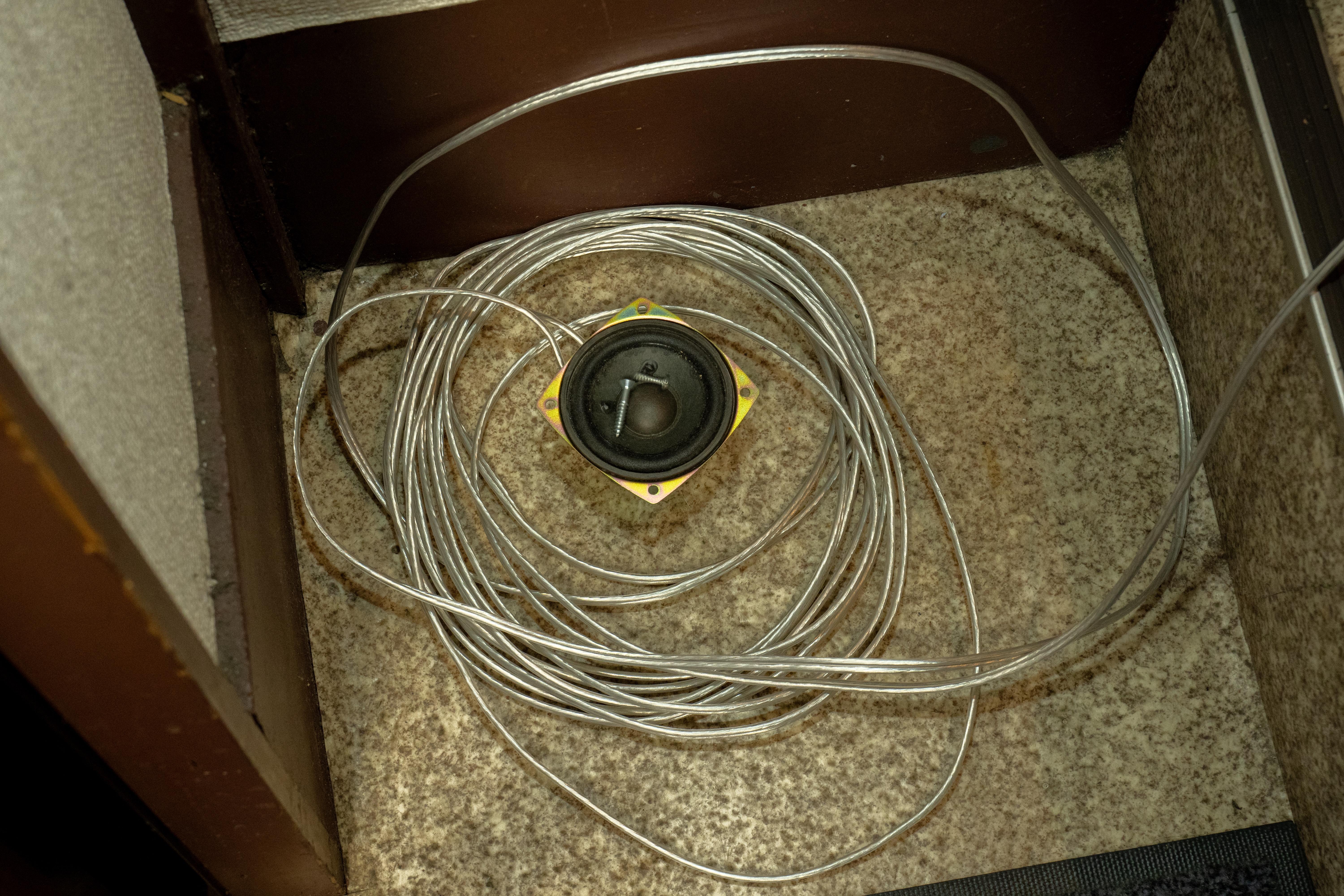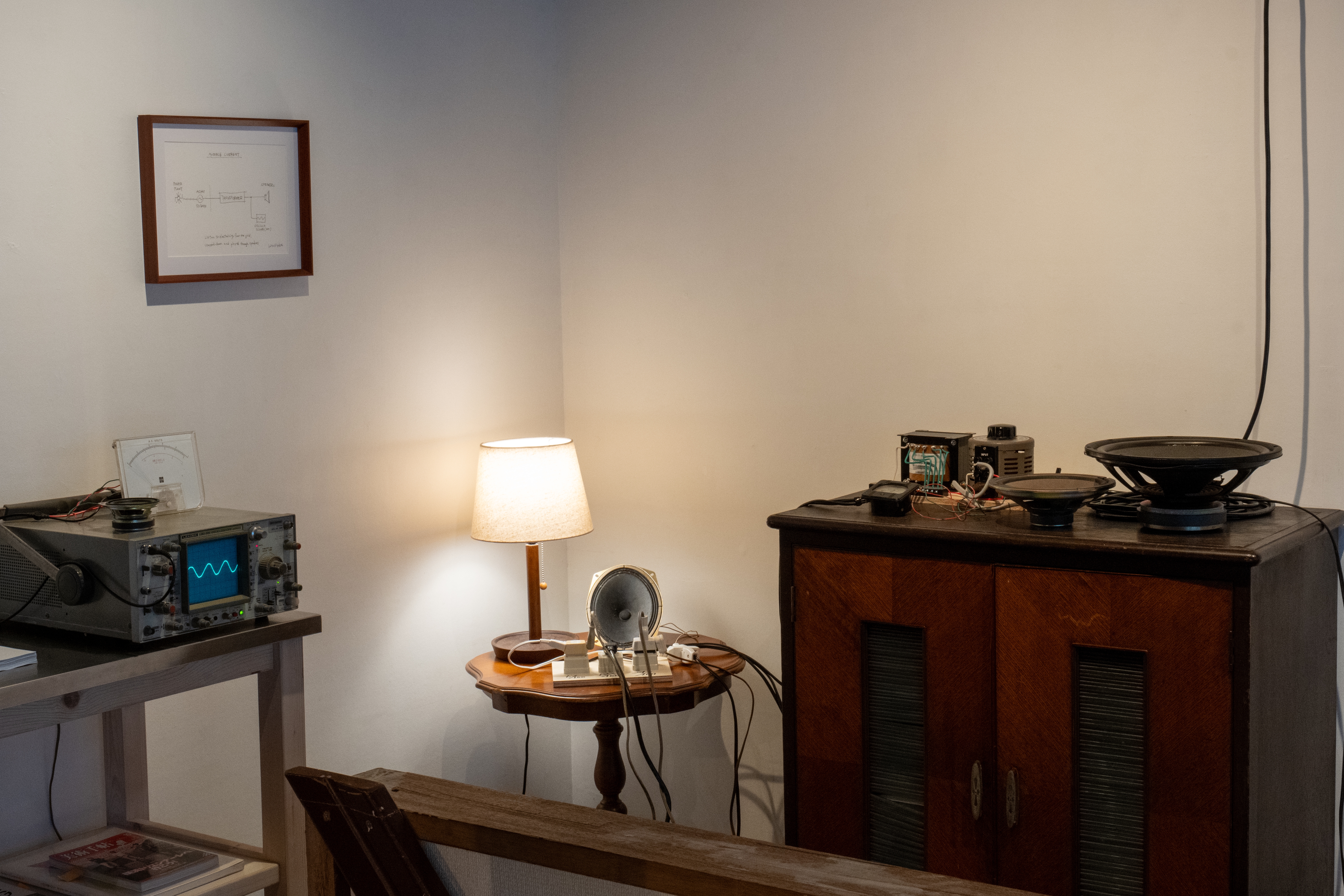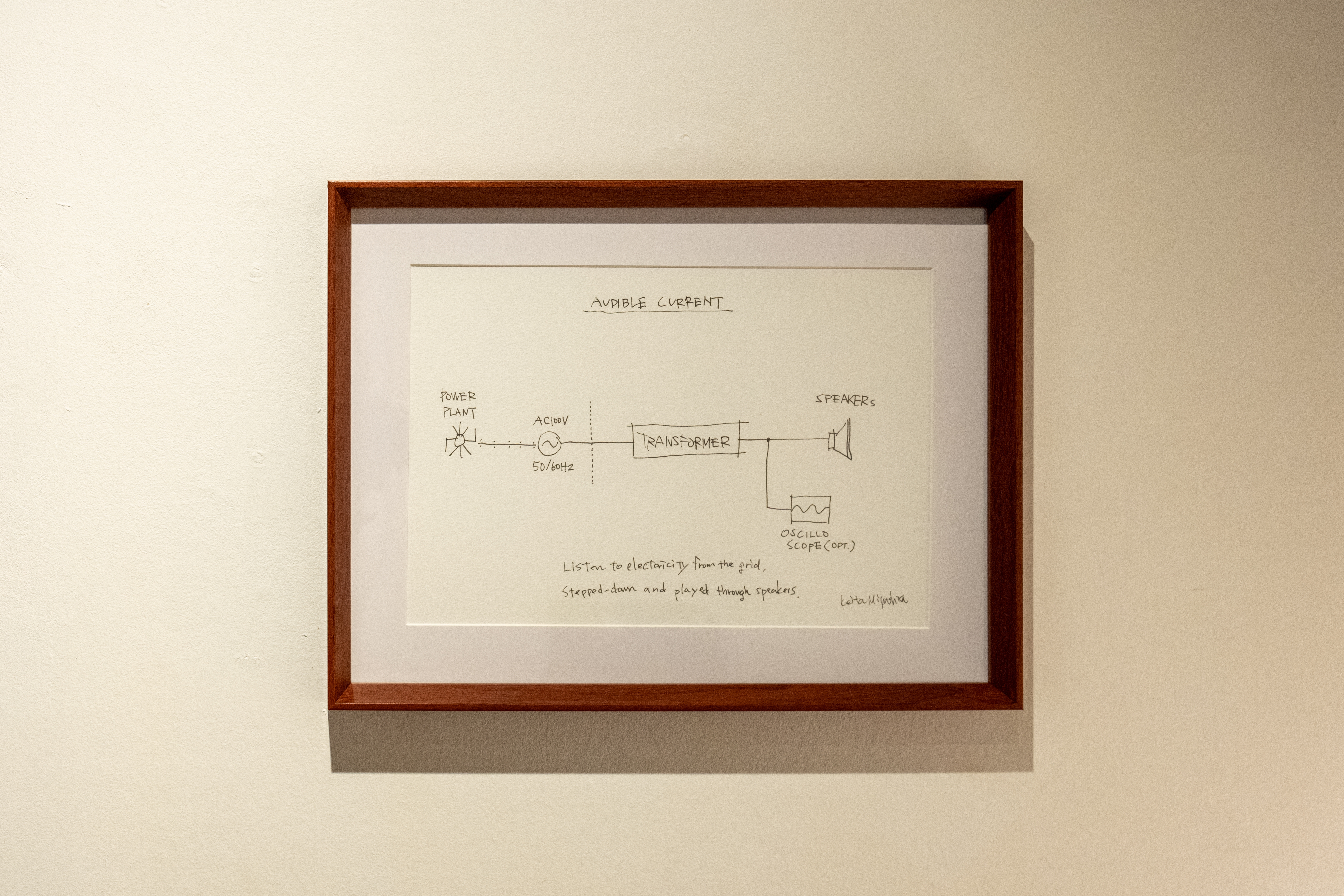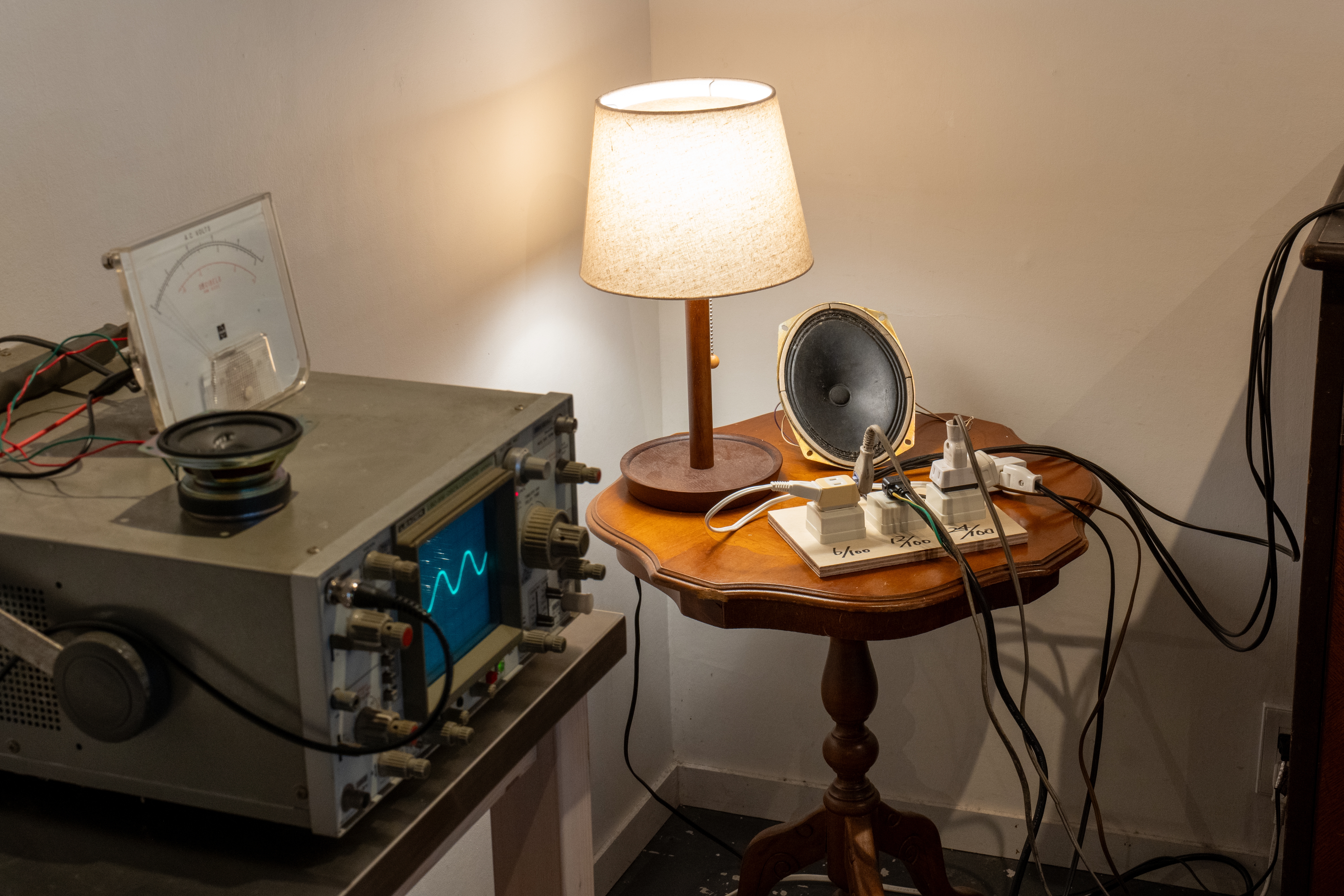 本展では、都市の電力供給網を巨大な音響装置として読み替え、どこか遠くの発電所で生成されたであろう正弦波を、空気の振動として聴くための装置、あるいはその振動を作品として提示する。送電線から屋内へと引き込まれた電気は、分電盤を通り壁のコンセントへ到達する。コンセントに接続された2つのトランスによって降圧した電源を、家庭用の電源タップなどを介してスピーカーへ分配する。スピーカーのコイルへと流れ込んだ交流電流は、電流による磁束と永久磁石とが生む電磁誘導の働きによってコーンを震わせ、空気の振動へと変換される。無意識のうちに消費される電流と同じように、空間に放たれた音もまた、時に私たちの鼓膜を揺らすことなく消失する。