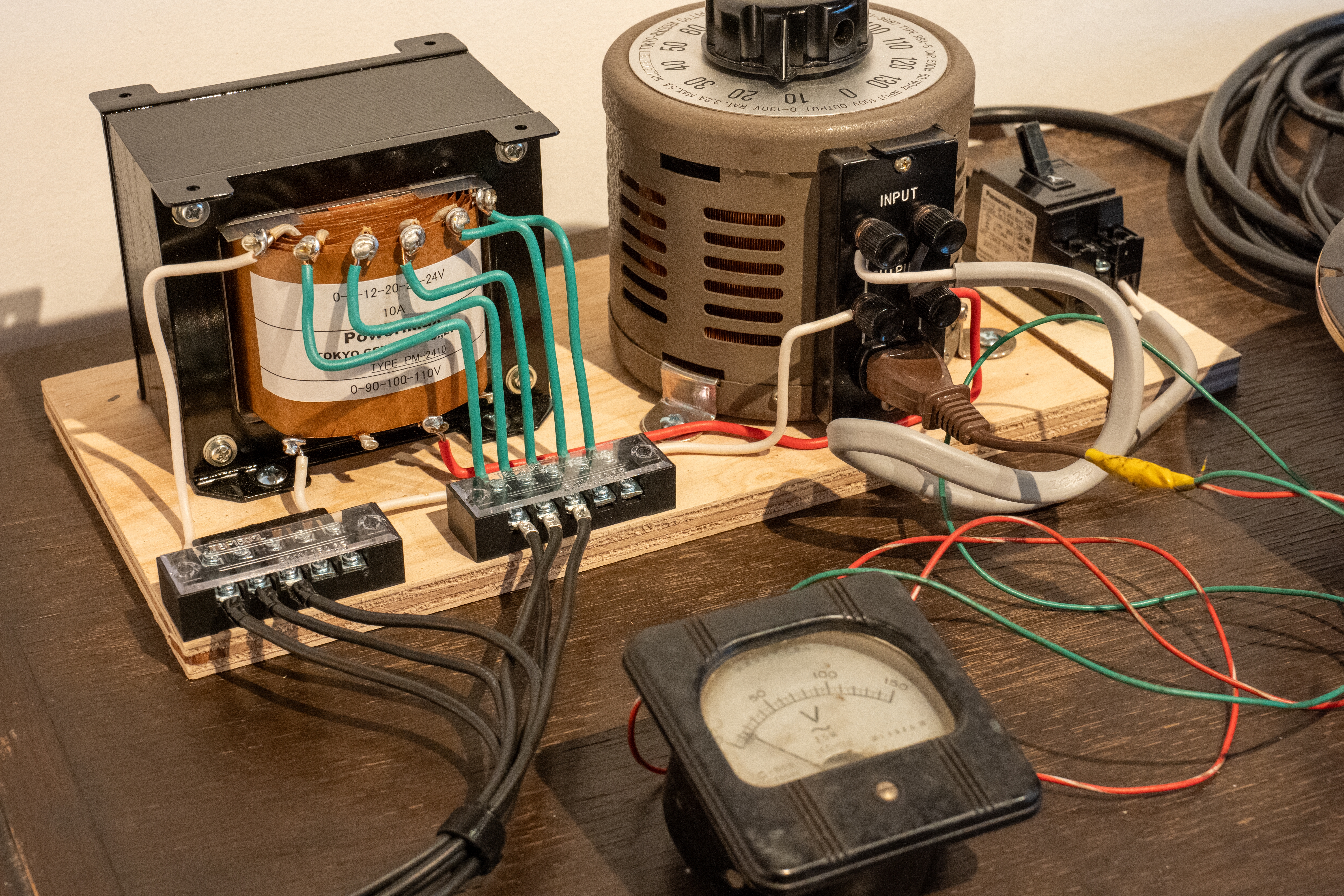 商用電源、トランス、オシロスコープ、電圧計、スピーカー、電源タップ など